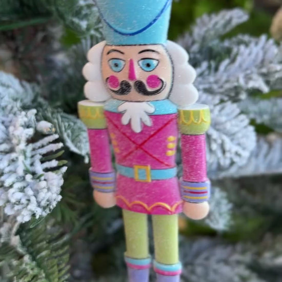 Frosted with glitter, two sided nutcracker. Made of resin.