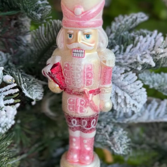 Glitter frosted nutcracker holding a present, standing on top of a macron. Made of glass.